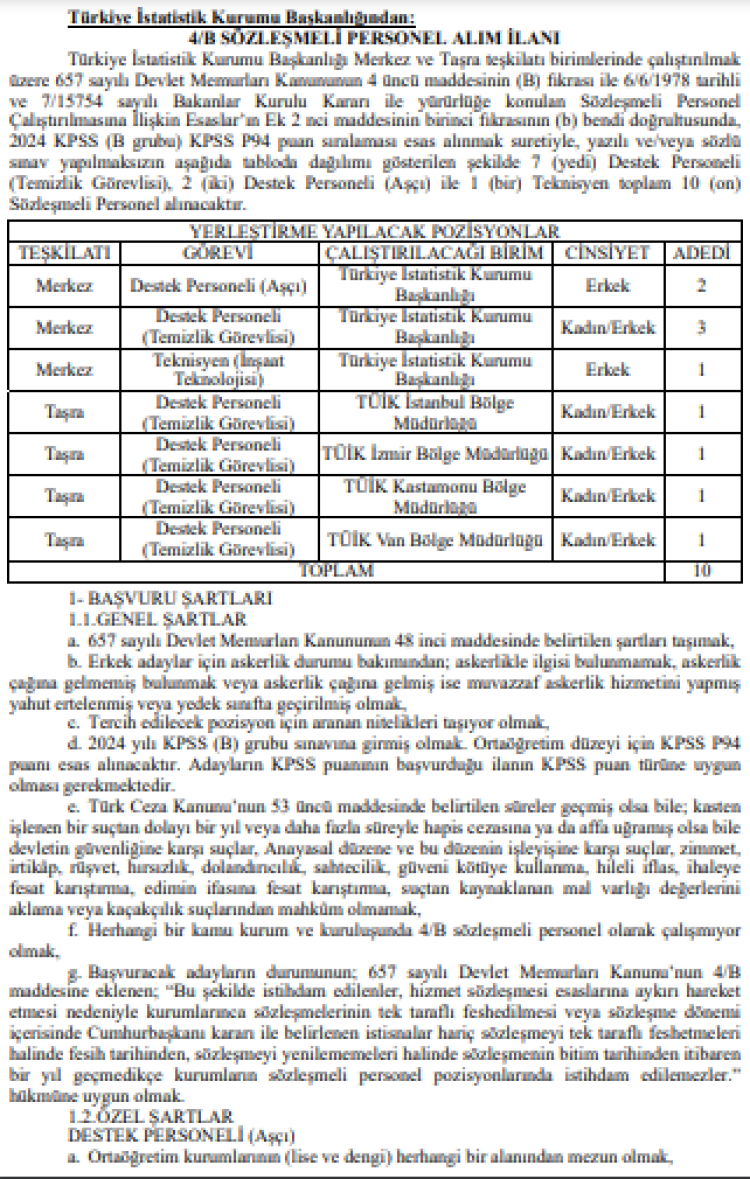Türkiye İstatistik Kurumu (TÜİK) merkez ve taşra teşkilatı birimlerine personel alımı yapacak.