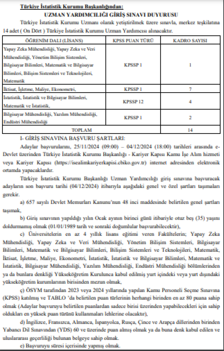 Türkiye İstatistik Kurumu (TÜİK) merkez ve taşra teşkilatı birimlerine personel alımı yapacak.