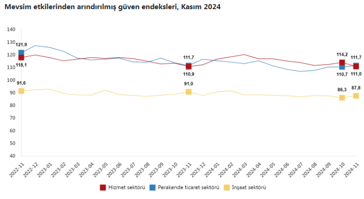 Türkiye İstatistik Kurumu (TÜİK), Kasım ayında güven endeksi hizmet sektöründe yüzde 2,9 azaldığı, perakende ticaret sektöründe yüzde 0,9, inşaat sektöründe yüzde 1,7 arttığı açıklandı.