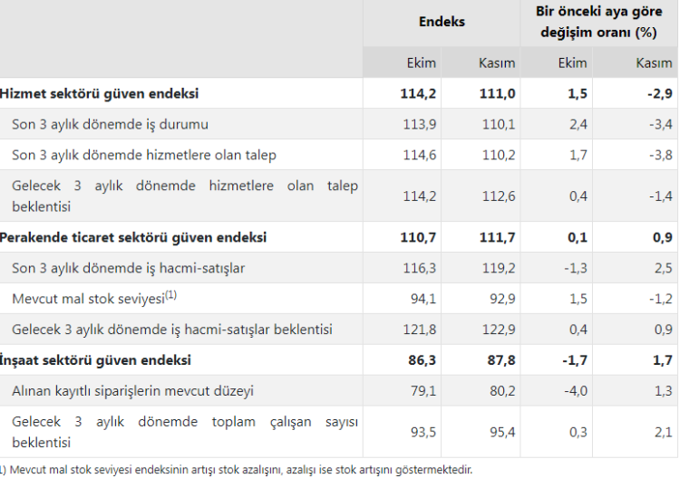 Türkiye İstatistik Kurumu (TÜİK), Kasım ayında güven endeksi hizmet sektöründe yüzde 2,9 azaldığı, perakende ticaret sektöründe yüzde 0,9, inşaat sektöründe yüzde 1,7 arttığı açıklandı.