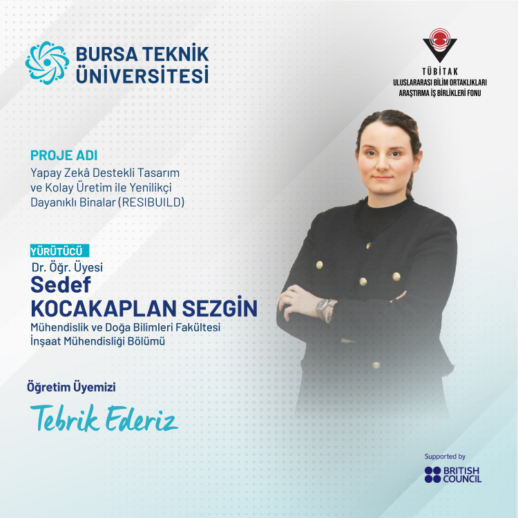 BURSA (İGFA) – Mühendislik ve Doğa Bilimleri Fakültesi İnşaat Mühendisliği Bölümü’nden Dr. Öğretim Üyesi Sedef Kocakaplan Sezgin’in “Yapay Zekâ Destekli Tasarım ve Kolay Üretim ile Yenilikçi Dayanıklı Binalar” (RESIBUILD) projesi, Türkiye-Birleşik Krallık ortaklığında, ‘Uluslararası Bilim Ortaklıkları-Araştırma İş Birlikleri Fonu’ tarafından desteklenmeye hak kazandı.