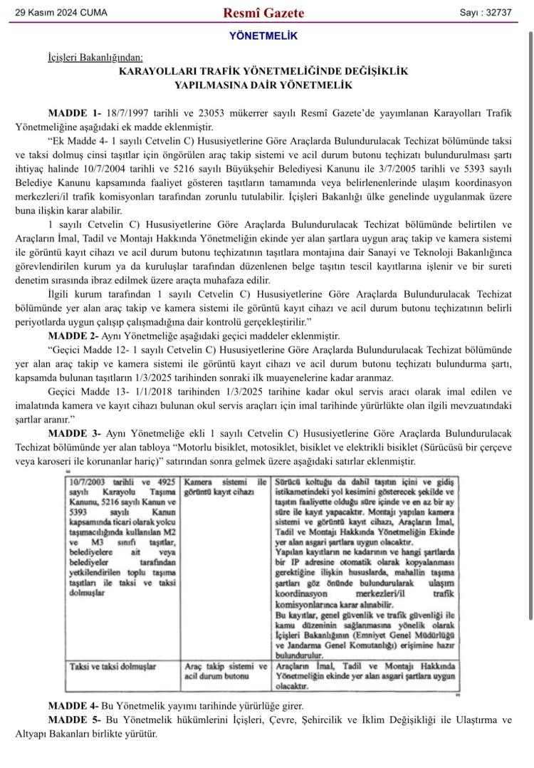 ANKARA (İGFA) – Karayolları Trafik Yönetmeliği’nde değişikliğe gidildi. Bugünkü Resmi Gazete’de yayımlanan yönetmelik değişikliğiyle, taksi ve dolmuşlara araç takip sistemi, kamera ve acil durum butonu zorunluluğu getirildi.