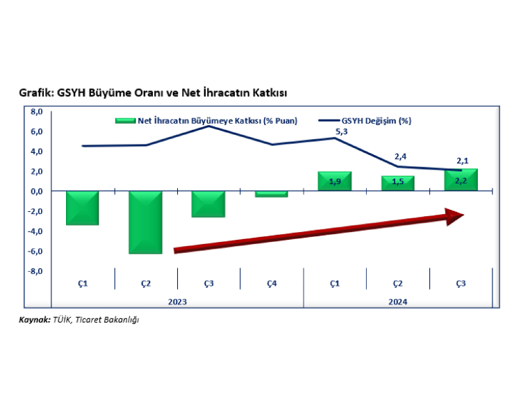 İhracatın artması ve ithalatın azalmasıyla söz konusu dönemdeki yüzde 3,2’lik büyümenin 1,9 puanının net mal ve hizmet ihracatından geldiğine işaret eden Bakan Bolat, üretimde büyümenin devam ettiğini, ihracatın mal ve hizmetler olarak artmasının ithalatın gerilemesi, böylece dış ticaret açığının azalması sayesinde ekonomik büyümeye net katkı sağladığını kaydetti.