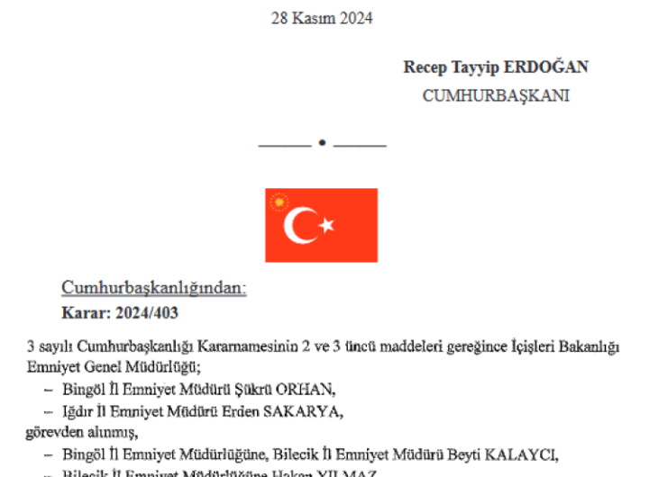 Cumhurbaşkanı Erdoğan’ın imzasıyla bugünkü Resmi Gazete’de yayımlanan karara göre, 6 şehrin emniyet müdürü değişirken, Bilecik ve Iğdır...