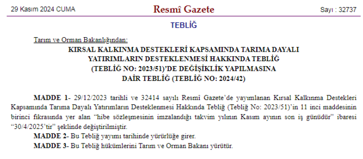 Tarım ve Orman Bakanlığı, kırsal kalkınma destekleri kapsamındaki tarıma dayalı yatırım projelerinin Kasım ayının son iş günü...