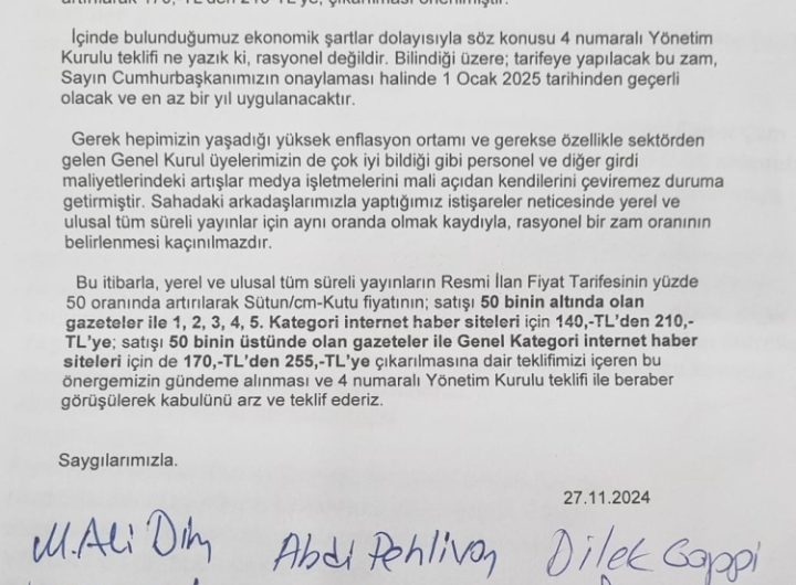 Basın İlan Kurumu (BİK) genel kurulu İstanbul’da toplandı. Resmi ilan fiyat tarifesine asgari yüzde 50 zam yapılması...