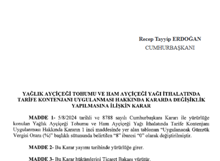 Bugün Resmi Gazete’de yayımlanan Cumhurbaşkanı Kararı ile yağlık ayçiçeği tohumu ithalatında gümrük vergisi sıfırlandı. Edirne Milletvekili ve...