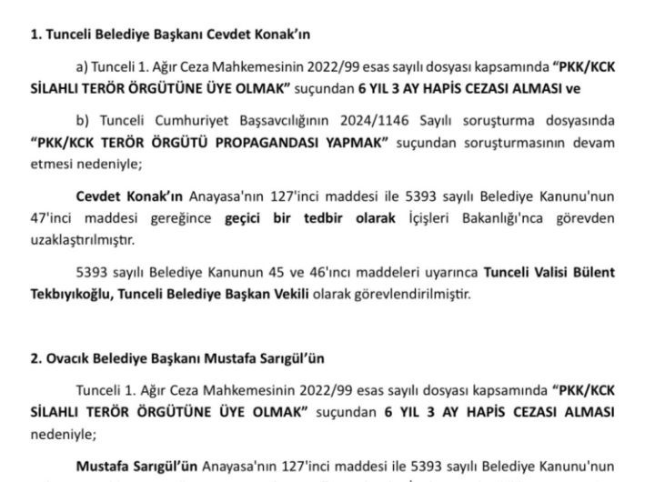 İçişleri Bakanlığı, Tunceli Belediye Başkanı Cevdet Konak ve Ovacık Belediye Başkanı Mustafa Sarıgül’ün görevden uzaklaştırıldığını ve yerlerine...