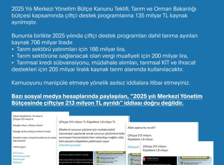 Bazı sosyal medya hesaplarında paylaşılan, “2025 yılı Merkezi Yönetim Bütçesinde çiftçiye 213 milyon TL ayrıldı” iddiası doğru...