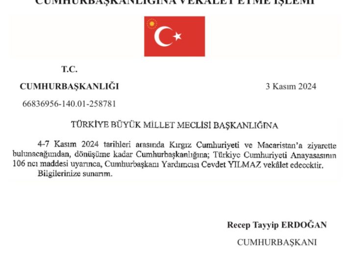 Cumhurbaşkanı Erdoğan’ın 4-7 Kasım 2024 tarihlerinde yapacağı yurt dışı ziyareti dolayısıyla Cumhurbaşkanlığı görevi Cumhurbaşkanı Yardımcısı Cevdet Yılmaz...