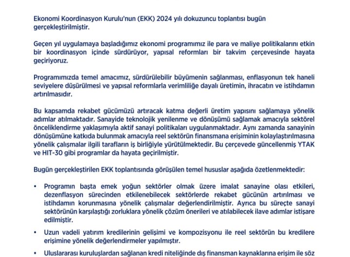 Yılın dokuzuncu toplantısını gerçekleştiren Cumhurbaşkanı Yardımcısı Cevdet Yılmaz başkanlığındaki Ekonomi Koordinasyon Kurulu, sanayi sektörünün karşılaştığı zorluklara yönelik...