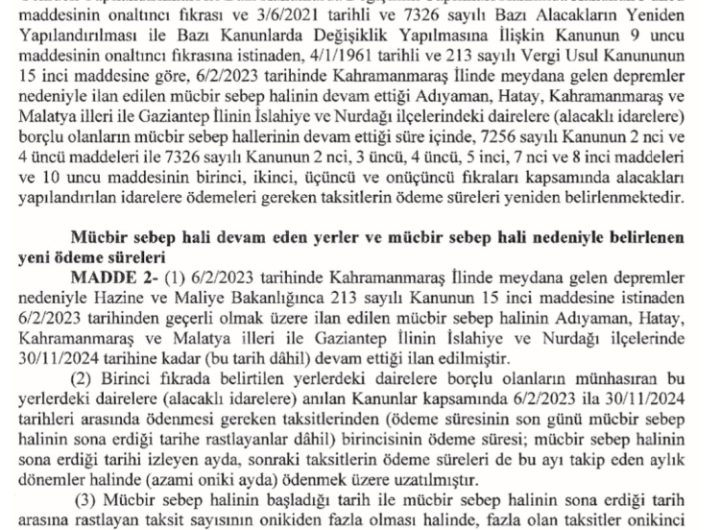 Kahramanmaraş merkezli depremlerden etkilenen 4 il ve 2 ilçedeki mükelleflerin, yapılandırma başvuru ile ödeme süreleri Cumhurbaşkanı Kararı...