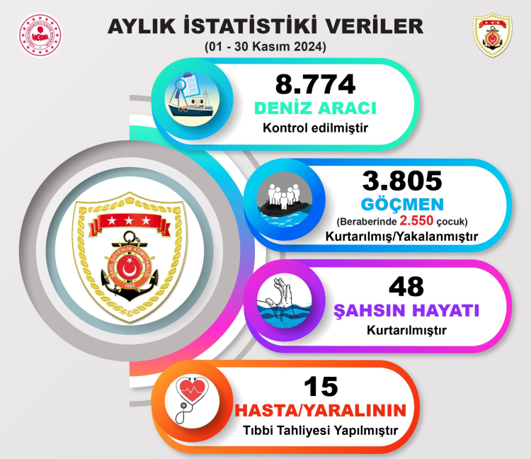 1 – 30 Kasım 2024 tarihleri arasında sorumluluk sahamızda gerçekleştirdiğimiz faaliyetleri paylaşan Sahil Güvenlik Komutanlığı, 8 bin 774 deniz aracının kontrol edildiğini, 3 bin 805 göçmenin kurtarılarak yakalandığını açıkladı.