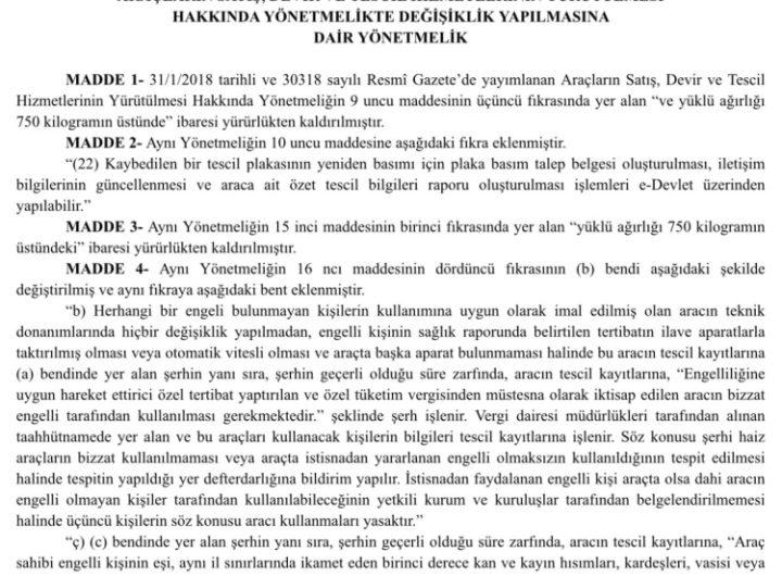 ANKARA (İGFA) – Resmi Gazete’de ‘Araçların Satış, Devir ve Tescil Hizmetlerinin Yürütülmesi Hakkında Yönetmelikte Değişiklik Yapılmasına Dair...