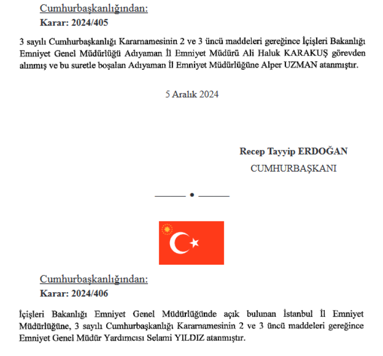 ANKARA (İGFA) – Cumhurbaşkanı Recep Tayyip Erdoğan’ın imzasıyla bugünkü Resmi Gazete’de yayımlanan karar ile emniyet teşkilatında iki ilde müdür değişiklikleri gerçekleştirildi.