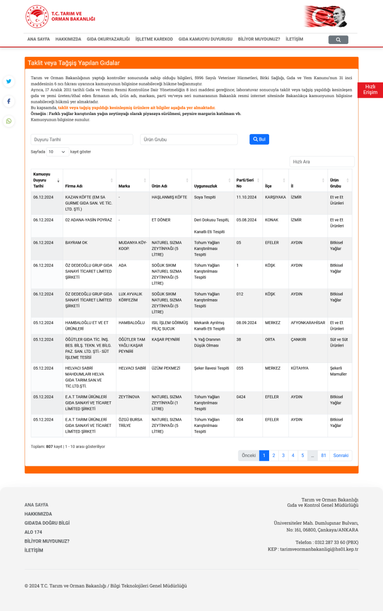An itibariyle taklit ve tağşiş yapıldıı kesinleşen listede bulunan ürünlerde, kanatlı eti, sakatat ve tek tırnaklı tespiti ile taklit, tağşiş ve bitkisel yağ tespiti gibi birçok uygunsuzluk yer alıyor.