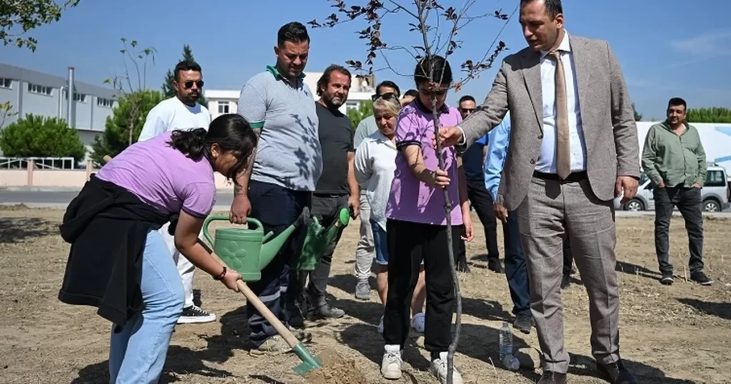 İZMİR (İGFA) – Üniversite öğrencilerinin katılımıyla gerçekleşen etkinlikte zeytin, ceviz, badem, akasya ve çınar fidanları toprakla buluşturuldu.