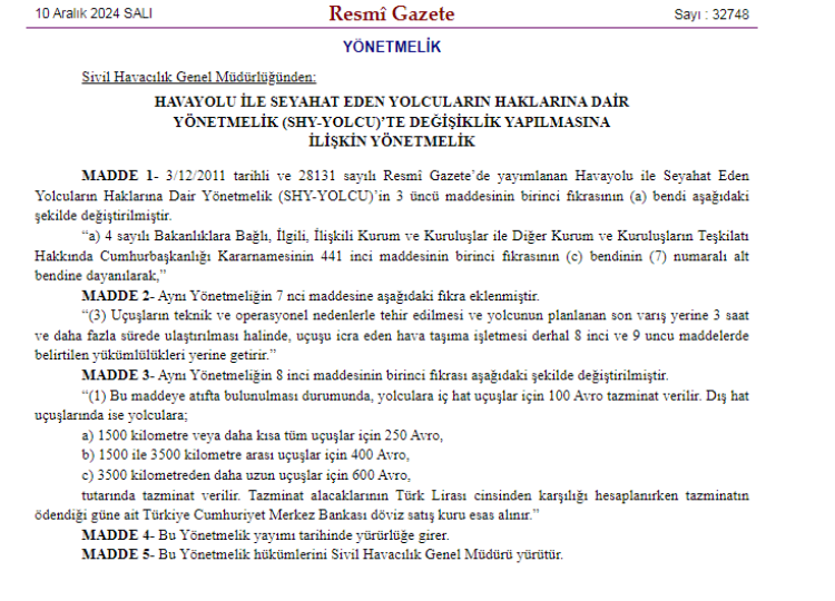 Yeni düzenlemeyle uçuşların teknik ve operasyonel nedenlerle gecikmesi durumunda, yolcuların planlanan son varış noktasına 3 saat veya daha fazla sürede ulaştırılması halinde, hava yolu şirketleri belirlenen yükümlülükleri yerine getirmekle sorumlu olacak.