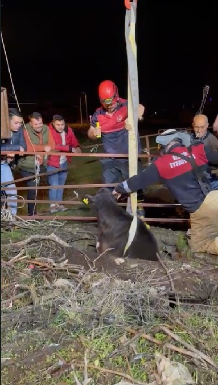 Kuyu içine özel ekipmanla inen ekipler hayvanı kurtarma sapanları ile sabitledi.