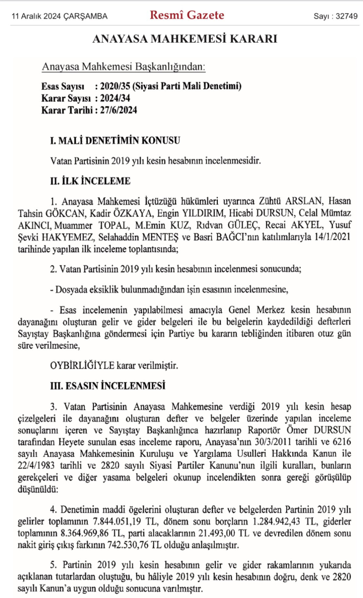ANKARA (İGFA) – Ekonomi ve Kalkınma Partisi, Anavatan Partisi, Adalet Birlik Partisi, Hür Dava Partisi, Kürdistan Özgürlük Partisi, İşçinin Kendi Partisi, Vatan Partisi, Adalet ve Kalkınma Partisi, Halkların Demokratik Partisi’nin olduğu 9 siyasi partinin çeşitli yıllarına ilişkin mali denetimleri bugünkü Resmi Gazete’de yayımlandı.