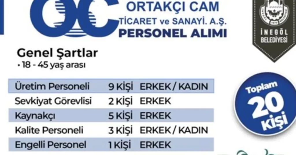 İnegöl Belediyesi İstihdam Merkezinden yapılan açıklamada, Ortakçı Cam firmasında çalışmak üzere personel alımı yapılacağı duyuruldu. Açıklamada şu ifadelere yer verildi: “İstihdam Merkezimizle iş birliği yapan Ortakçı Cam firması, İnegöl’de bulunan fabrikada farklı bölümlerde çalışacak personel alımı yapacak. Aranan genel şartlarda başvuracak kişilerin 18-45 yaş arasında olması gerektiği ifade edildi. Üretim personeli olarak kadın veya erkek 9 personel, sevkiyat görevlisi olarak 2 erkek, kaynakçı 5 erkek, kalite personeli 3 kadın veya erkek ve engelli personel kontenjanında çalışacak 1 erkek personel olmak üzere toplam 20 personel alınacak. Firmada çalışanlara sunulan imkanlar ise; alışveriş kartı, yakacak yardımı, servis, bayram harçlığı ve yemek olarak ifade edildi. Cumartesi Pazar çalışma olmadığı, çalışma saatlerinin ise 08.00-18.00 ile 18.00-04.00 olmak üzere 2 vardiya olduğu belirtildi.”