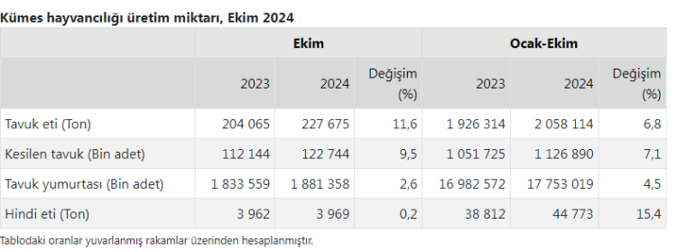 Ocak-Ekim döneminde bir önceki yılın aynı dönemine göre, tavuk yumurtası üretimi yüzde 4,5 arttı, kesilen tavuk sayısı yüzde 7,1 arttı, tavuk eti üretimi yüzde 6,8 arttı, hindi eti üretimi yüzde 15,4 arttı.