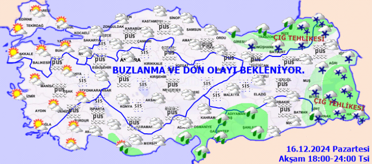 Kıyı kesimlerde sağanak, iç kesimlerde yağmur ve karla karışık yağmur, iç kesimlerin yükseklerinde kar olarak görülmesi beklenen yağışların, Antalya’nın doğu kıyılarında yerel kuvvetli olacağı tahmin ediliyor. Ülkemizin iç ve doğu kesimlerinde buzlanma ve don ile birlikte pus ve yer yer sis görüleceği tahmin edilirken, Doğu Karadeniz’in iç kesimlerinin yüksekleri ile Doğu Anadolu’nun doğusunun dik ve eğimli yamaçlarında çığ tehlikesi bulunduğu bildirildi.