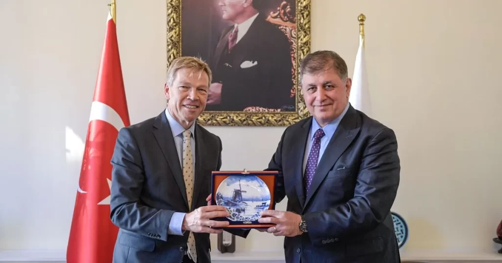 İZMİR (İGFA) – Hollanda’nın Ankara Büyükelçisi Joep Wijnands ve İzmir Fahri Konsolosu Oğuz Özkardeş, İzmir Büyükşehir Belediye Başkanı Dr. Cemil Tugay’ı makamında ziyaret etti. Görüşmede deniz temizliği, altyapı çalışmaları, ulaşım, tarım, sağlık turizmi ve Botanik EXPO gibi konular gündeme geldi.