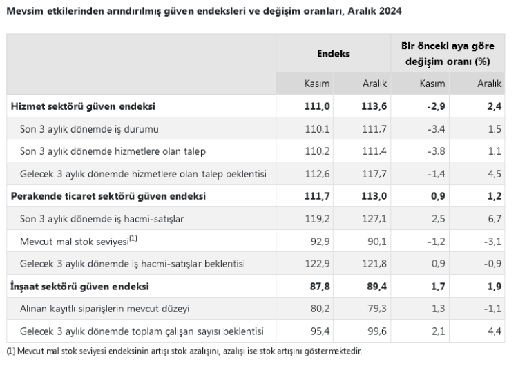 Mevsim etkilerinden arındırılmış güven endeksi Aralık ayında bir önceki aya göre; hizmet sektöründe yüzde 2,4 oranında artarak 113,6 değerini, perakende ticaret sektöründe yüzde 1,2 oranında artarak 113,0 değerini ve inşaat sektöründe yüzde 1,9 oranında artarak 89,4 değerini aldı.