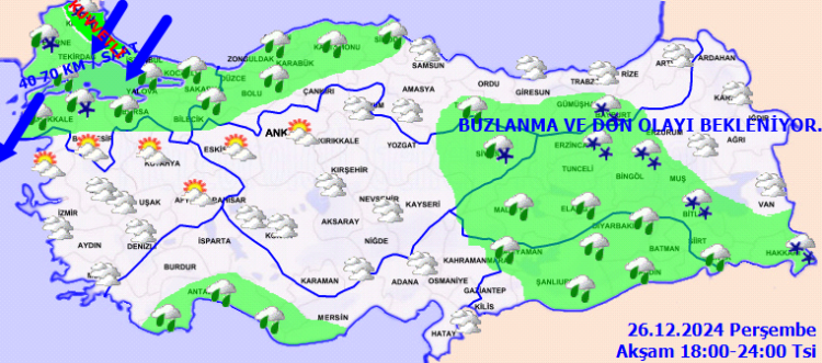 ANKARA (İGFA) – Meteoroloji Genel Müdürlüğü, 26 Aralık Perşembe gününe ilişkin hava tahmin raporunu yayımladı.