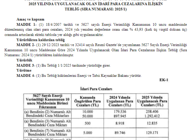 ANKARA (İGFA) – Enerji ve Tabii Kaynaklar Bakanlığı, Enerji Verimliliği Kanunu kapsamında uygulanacak idari para cezalarını 1...