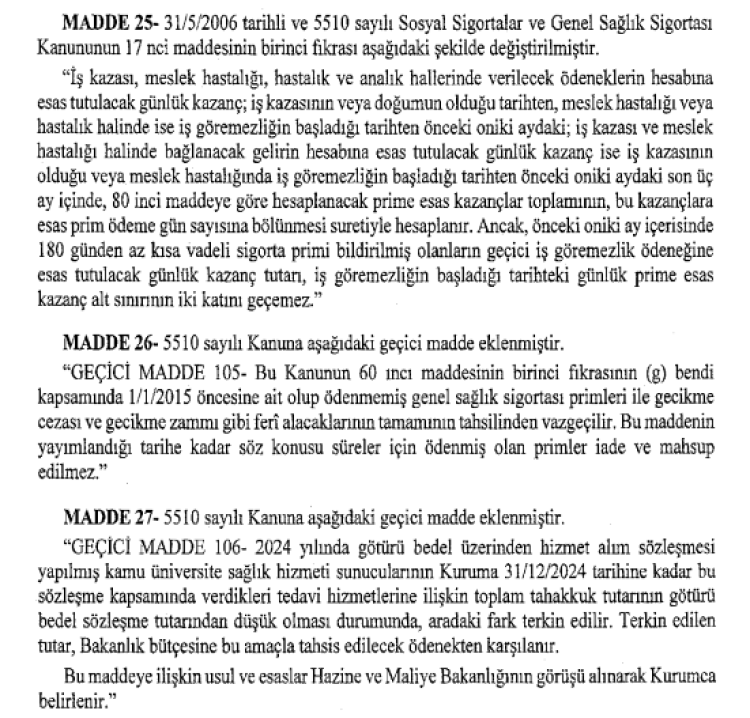 İlgili kararın 25, 26 ve 27’nci maddelerine göre Sosyal Sigortalar ve Genel Sağlık Sigortası Kanunu’ndaki değişiklikle iş kazası, meslek hastalığı, hastalık ve analık hallerinde verilecek ödeneklerin hesabına esas tutulacak günlük kazanç; iş kazasının veya doğumun olduğu tarihten, meslek hastalığı veya hastalık halinde ise iş göremezliğin başladığı tarihten önceki 12 aydaki; iş kazası ve meslek hastalığı halinde bağlanacak gelirin hesabına esas tutulacak günlük kazanç ise iş kazasının olduğu veya meslek hastalığında iş göremezliğin başladığı tarihten önceki 12 aydaki son 3 ay içinde, hesaplanacak prime esas kazançlar toplamının, bu kazançlara esas prim ödeme gün sayısına bölünmesi suretiyle hesaplanacak.