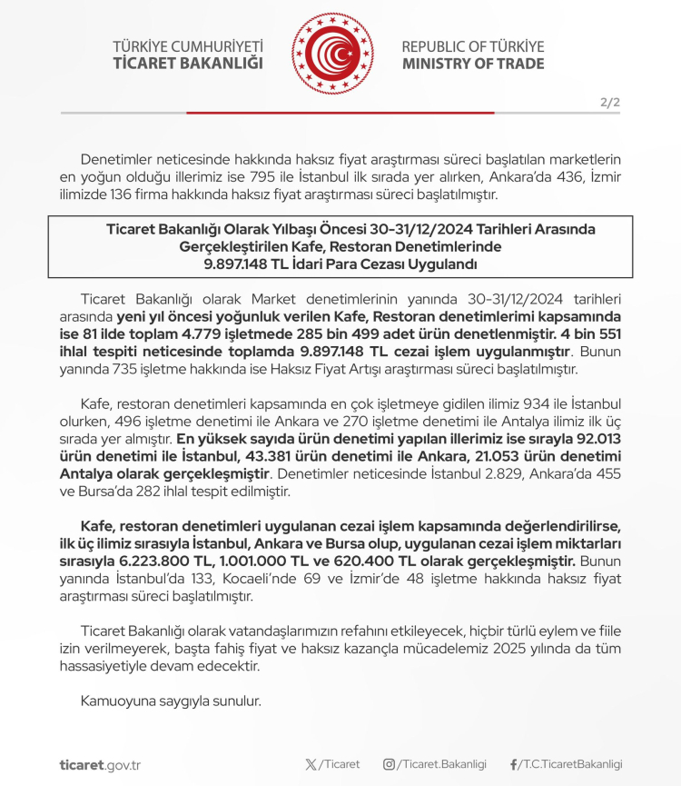 Ticaret Bakanlığı, yılbaşı öncesi 30-31 Aralık tarihlerinde gerçekleştirdiği kafe, restoran denetimlerine ilişkin de şu açıklamaları kaydetti: