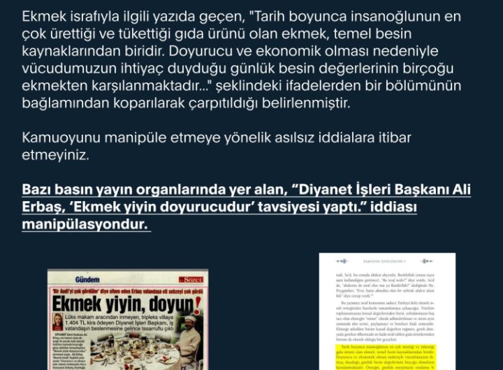 Bazı basın yayın organlarında yer alan, “Diyanet İşleri Başkanı Ali Erbaş, ‘Ekmek yiyin doyurucudur’ tavsiyesi yaptı.” iddiasının...