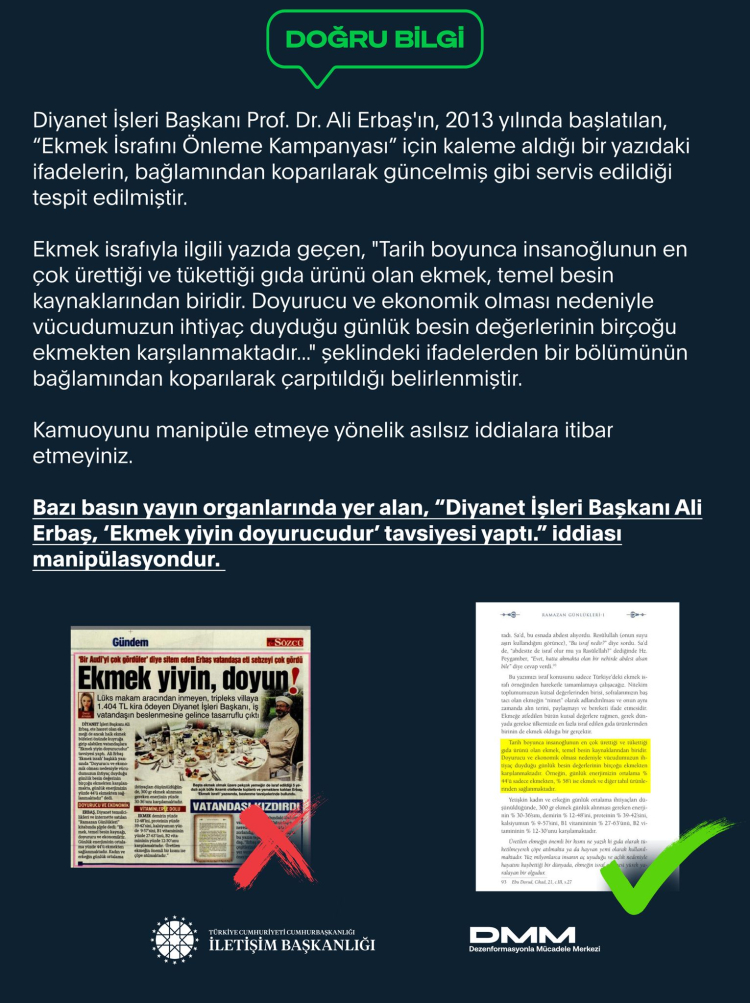 Dezenformasyonla Mücadele Merkezi tarafından yapılan açıklamada, “Diyanet İşleri Başkanı Prof. Dr. Ali Erbaş’ın, 2013 yılında başlatılan, “Ekmek İsrafını Önleme Kampanyası” için kaleme aldığı bir yazıdaki ifadelerin, bağlamından koparılarak güncelmiş gibi servis edildiği tespit edilmiştir. Ekmek israfıyla ilgili yazıda geçen, “Tarih boyunca insanoğlunun en çok ürettiği ve tükettiği gıda ürünü olan ekmek, temel besin kaynaklarından biridir. Doyurucu ve ekonomik olması nedeniyle vücudumuzun ihtiyaç duyduğu günlük besin değerlerinin birçoğu ekmekten karşılanmaktadır…” şeklindeki ifadelerden bir bölümünün bağlamından koparılarak çarpıtıldığı belirlenmiştir. Kamuoyunu manipüle etmeye yönelik asılsız iddialara itibar etmeyiniz” ifadeleri yer aldı.