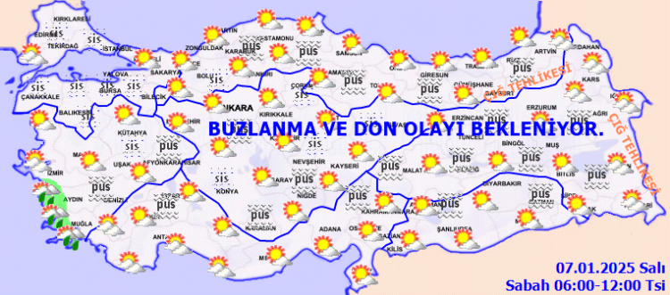 Meteoroloji 7 Ocak Salı gününe ilişkin hava tahmin raporuna göre sabah ve gece saatlerinde iç ve doğu kesimlerinde buzlanma ve don ile birlikte pus ve yer yer sis bekleniyor. Doğu Karadeniz’in iç kesimlerinin yüksekleri ile Doğu Anadolu’nun yüksek ve dik yamaçlarında çığ tehlikesi bulunuyor.