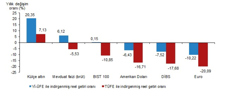 Yıllık değerlendirmede, Yİ-ÜFE ile indirgendiğinde; yatırım araçlarından mevduat faizi (brüt) yüzde 6,12 ve BIST 100 endeksi yüzde 0,15 oranında yatırımcısına reel getiri sağlarken; Amerikan Doları yüzde 6,43, DİBS yüzde 7,52 ve Euro yüzde 10,22 oranlarında yatırımcısına kaybettirdi.