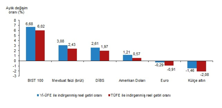 TÜFE ile indirgendiğinde; mevduat faizi (brüt) yüzde 2,43, DİBS yüzde 1,97 ve Amerikan Doları yüzde 0,57 oranlarında yatırımcısına reel getiri sağlarken; Euro yüzde 0,91 ve külçe altın yüzde 2,08 oranlarında yatırımcısına kaybettirdi.