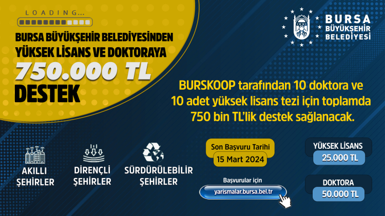 Büyükşehir Belediyesi tarafından kentin ihtiyaçlarına yönelik özgün ve yenilikçi çözümler üretilmesine katkı sağlamak amacıyla hazırlanan ‘Lisansüstü Tez Destek Programı’ndan destek almaya hak kazananlar da belirlendi. Program kapsamında destek almaya hak kazanan araştırmacıların listesine https://yarismalar.bursa.bel.tr adresinden ulaşılabilir.