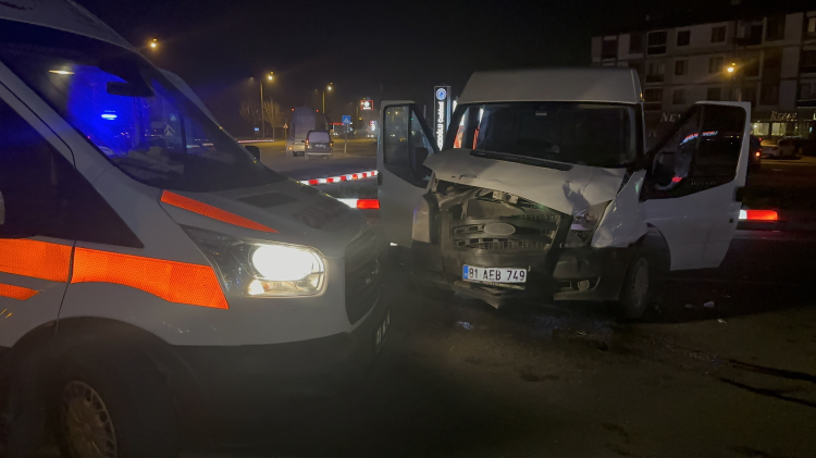 Sefer DEMİR / DÜZCE (İGFA) – Alınan bilgiye göre Kalıcı Konutlar’dan Düzce istikametine giden B. E. idaresindeki 81 AEB 749 plakalı servis minibüsü Muhsin Yazıcıoğlu bulvarı ışıklı kavşakta K.A. yönetimindeki 81 ACJ 498 plakalı servis minibüsü ile çarpıştı. Çarpışmanın etkisiyle araçta bulunan Ç. E. yaralandı.