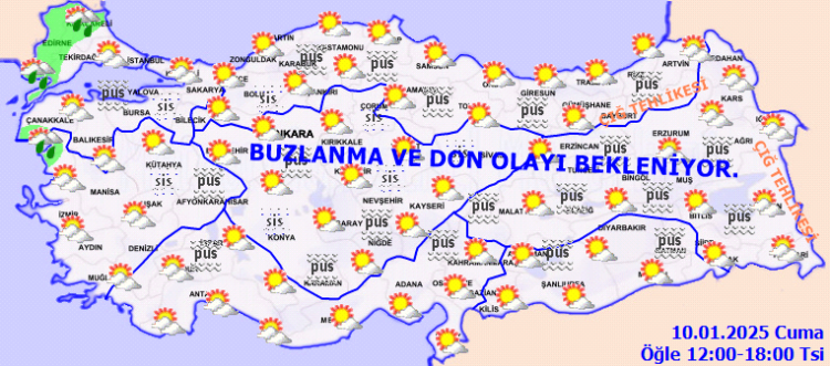 ANKARA (İGFA) – Meteoroloji Genel Müdürlüğü, 10 Ocak Cuma gününe ilişkin hava tahmin raporunu yayımladı. Sabah ve gece saatlerinde iç ve doğu kesimlerde buzlanma ve don ile birlikte pus ve yer yer sis bekleniyor. Doğu Karadeniz’in iç kesimlerinin yüksekleri ile Doğu Anadolu’nun yüksek ve dik yamaçlarında çığ tehlikesi bulunmaktadır.