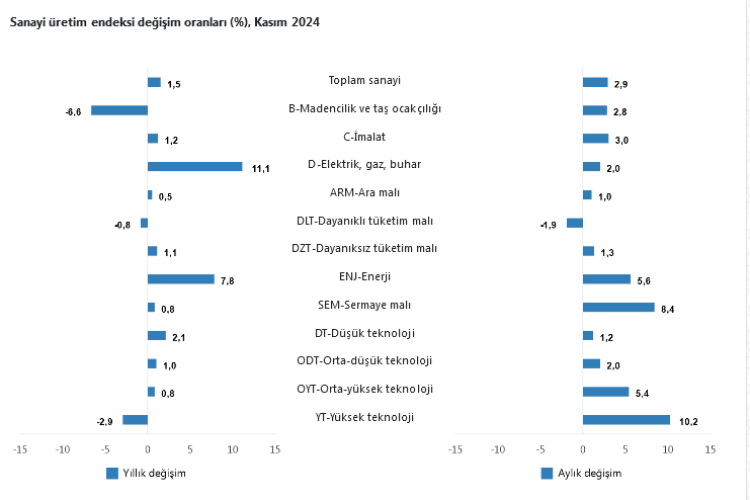 Sanayinin alt sektörleri (2021=100 referans yıllı) incelendiğinde, 2024 yılı Kasım ayında madencilik ve taş ocakçılığı sektörü endeksi bir önceki yılın aynı ayına göre yüzde 6,6 azaldı, imalat sanayi sektörü endeksi yüzde 1,2 arttı ve elektrik, gaz, buhar ve iklimlendirme üretimi ve dağıtımı sektörü endeksi yüzde 11,1 arttı.