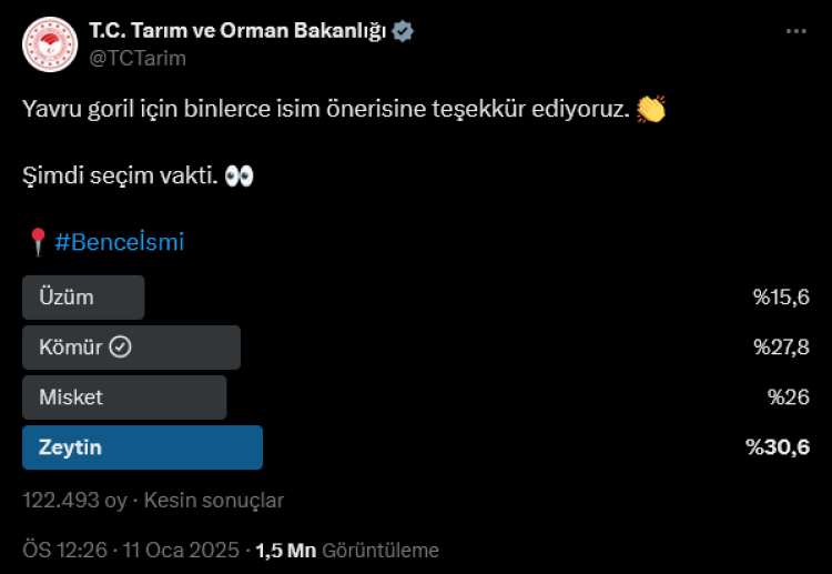 İsim önerileri arasından belirlene 4 ismi oylamaya sunan Tarım ve Orman Bakanlığı’nın paylaşpımında, ‘Zeytin’ ismi yüzde 30,6’lık oy oranı ile birinci oldu.