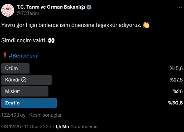 İstanbul Havalimanı’nda yakalanan ve rehabilitasyon süreci devam eden yavru gorilin adı Tarım ve Orman Bakanlığı’nın başlattığı sosyal...