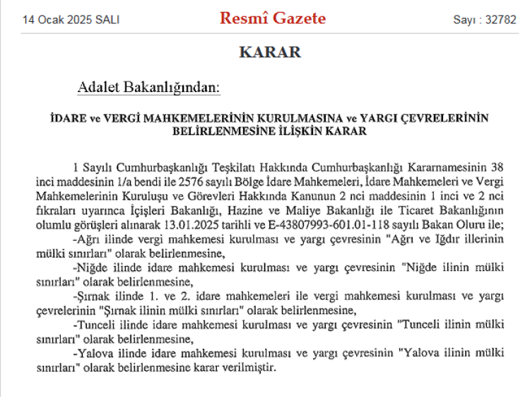 Adalet Bakanlığı’nın oluru ile Ağrı, Niğde, Şırnak, Tunceli ve Yalova illerinde idare ve vergi mahkemelerinin kurulmasına ilişkin karar bugünkü Resmi Gazete’de yayımlandı.