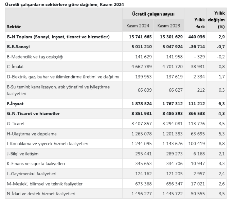 Sanayi, inşaat ve ticaret-hizmet sektörleri toplamında ücretli çalışan sayısı 2024 Kasım ayında bir önceki yılın aynı ayına göre yüzde 2,9 arttı. Ücretli çalışan sayısı bir önceki yılın aynı ayında 15 milyon 301 bin 629 kişi iken, 2024 yılı Kasım ayında 15 milyon 741 bin 665 kişi oldu.
