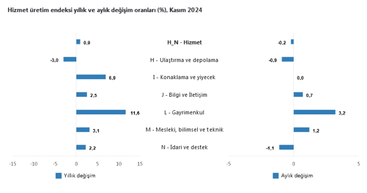 Hizmet üretim endeksi (2021=100) 2024 yılı Kasım ayında bir önceki aya göre yüzde 0,2 azaldı. Aynı ayda ulaştırma ve depolama hizmetleri yüzde 0,9 azaldı, konaklama ve yiyecek hizmetleri aynı kaldı, bilgi ve iletişim hizmetleri yüzde 0,7 arttı, gayrimenkul hizmetleri yüzde 3,2 arttı, mesleki, bilimsel ve teknik hizmetler yüzde 1,2 arttı, idari ve destek hizmetleri ise yüzde 1,1 azaldı.