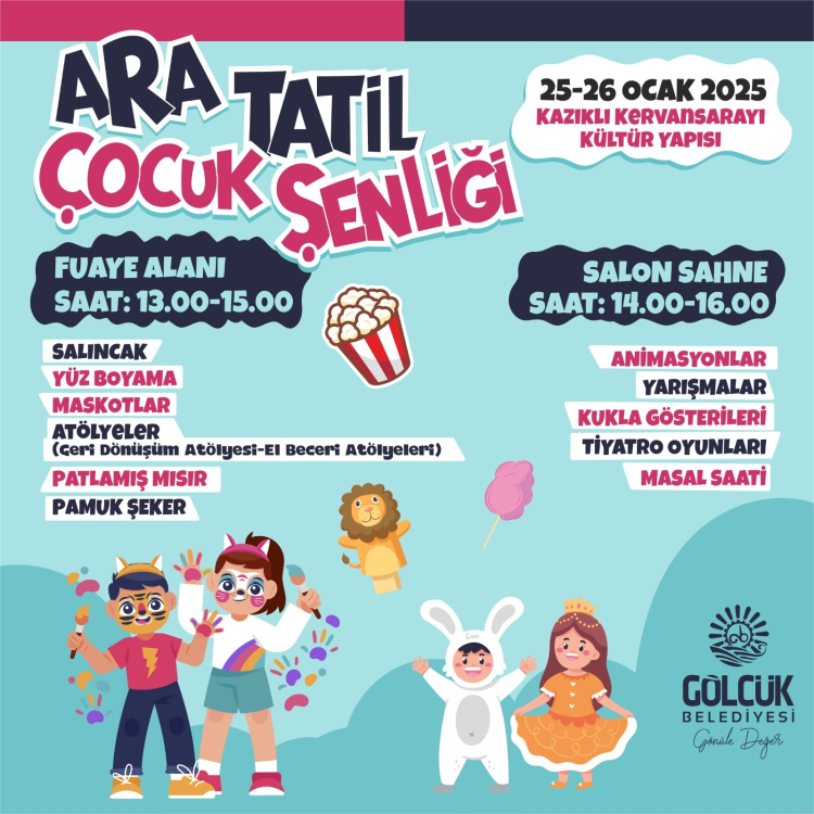 Kocaeli Gölcük Belediyesi; yarıyıl tatili döneminde ilçede yaşayan çocukları 25-26 Ocak tarihlerinde Kervansaray’da düzenlenecek “Ara Tatil Çocuk Şenliği’nde bir araya getirecek.