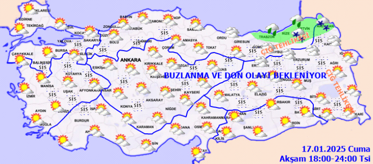 Hava sıcaklığının iç kesimlerde 2 ile 4 derece azalacağı yurt genelinde önemli bir değişiklik olmayacak. Haftanın son iş gününde Türkiye’nin iç ve doğu kesimlerinde buzlanma ve don ile birlikte pus ve yer yer sis beklenirken, Doğu Karadeniz’in iç kesimlerinin yüksekleri ile Doğu Anadolu’nun yüksek ve dik yamaçları için çığ tehlikesi uyarısı geldi.