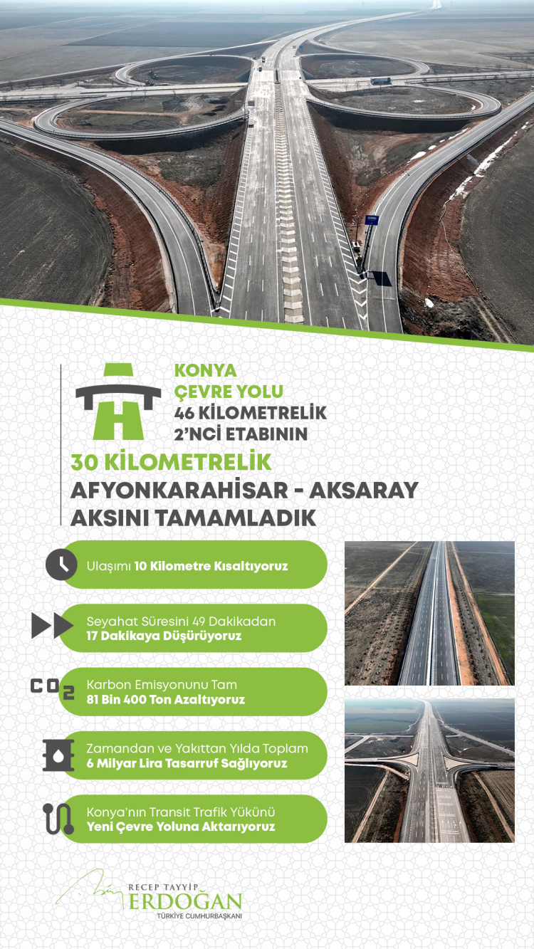 Cumhurbaşkanı Recep Tayyip Erdoğan, Konya Çevre Yolu 2. Kesimi’nin açılış töreninde yaptığı konuşmada proje ile birlikte yaklaşık 6 milyar lira tasarruf edileceğini açıkladı. Erdoğan, söz konusu yolun Afyonkarahisar-Aksaray aksı arasındaki 30 kilometrelik kesiminin bölgeye hayırlı olmasını diledi.